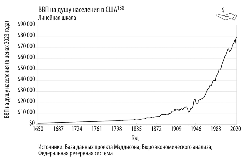 Неудивительно, что ВВП США рос экспоненциально, ведь увеличение численности населения всегда влечет подъем экономики. Однако ВВП на душу населения – показатель, который учитывает количество жителей – также увеличивался с аналогичной скоростью137. И вновь отметим, что эти параметры не включают в себя оценку бесплатных информационных сервисов и не учитывают экспоненциальный рост вычислительной мощности, доступной за ту же цену, что и раньше.