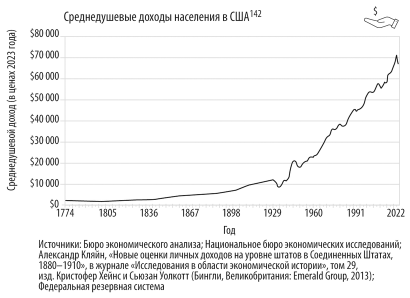 Средний дневной доход жителя США неуклонно растет. В 2023 году чертой бедности считался доход ниже 14 580 долларов на человека в год, что соответствует проживанию на 39 долларов 95 центов в день132. С 1941 года реальный средний (не медианный) доход в Америке всегда был выше черты бедности, установленной на 2023 год133.
