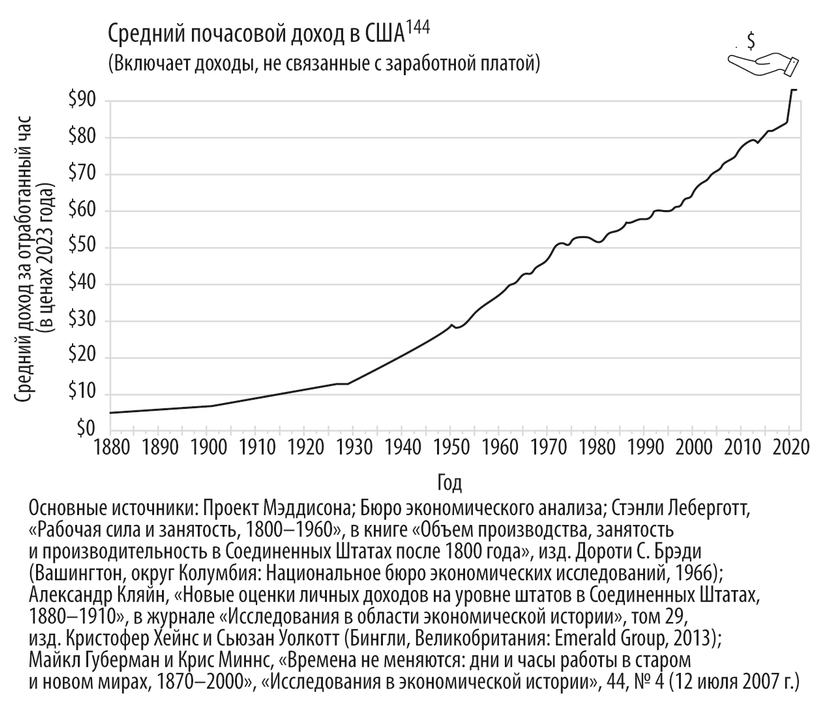 Годовой доход – это важный показатель, однако еще информативнее рассмотреть доход по отношению к отработанному времени. Реальный почасовой доход в США, скорректированный с учетом инфляции, постепенно растет. В 1880 году он составлял 5 долларов в час, а в 2021 году – уже 93 доллара в час143. Следует отметить, что личный доход состоит не только из заработной платы и гонораров. Он также включает в себя прибыль от инвестиций и собственного бизнеса, государственные пособия и единовременные выплаты, такие как во время пандемии в 2020 году. Поэтому доход за час обычно выше, чем почасовая оплата труда. В этой связи представляет интерес то, что доходы, не связанные с оплатой труда, составляют все большую долю личного дохода. Получается, что в целом экономика процветает, несмотря на сокращение рабочего времени типичного жителя страны.