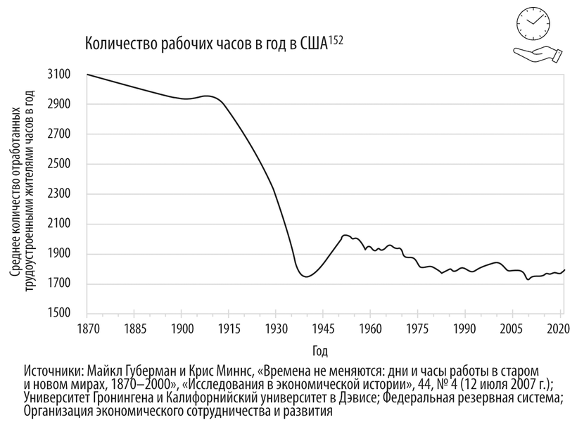 В конце XIX века среднестатистический американец работал около трех тысяч часов в год145. После 1910 года этот показатель начал быстро снижаться. Это произошло благодаря регулированию рынка труда и активной деятельности профсоюзов, которые добились уменьшения продолжительности рабочего дня и предоставления людям времени для отдыха146. Кроме того, работодатели заметили, что отдохнувшие работники более продуктивны и допускают меньше ошибок. Поэтому они стали распределять нагрузку между большим количеством людей, чем было принято в первые годы индустриальной революции. Во время Великой депрессии среднее количество рабочих часов в год упало до 1750, поскольку даже тем, кто не был уволен, пришлось работать меньше из-за сокращения продолжительности смен147. Однако в годы Второй мировой войны и последовавшего за ней подъема промышленности заводы и офисы снова открыли двери перед американцами, которые стали работать по 2000 часов в год148. С тех пор рабочий год в США медленно, но неуклонно сокращался, вернувшись в конце концов к нормам времен Великой депрессии149, с той разницей, что теперь люди сами предпочитают частичную занятость. Это позволяет им достичь гармоничного баланса между работой и отдыхом. В ряде европейских стран сокращение рабочего времени происходит еще активнее, чем в США150.