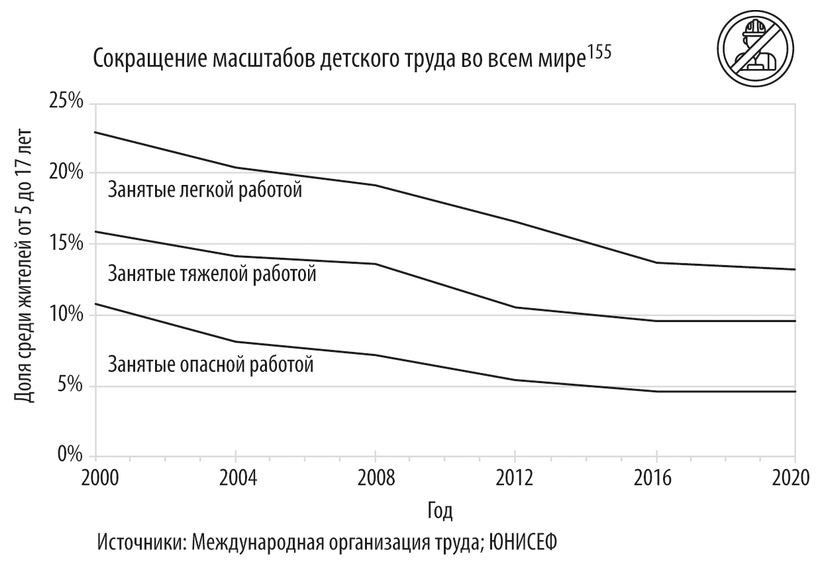 ООН и Международная организация труда выделяют три категории эксплуатации детей153. Самая широкая – «детская занятость» – включает в себя детей, вовлеченных в несложную работу на семейной ферме или в бизнесе родителей. Хотя такая деятельность может отвлекать от учебы, она считается сравнительно мягкой формой эксплуатации детей. Вторая категория, «детский труд», касается детей, занятых на работе, которую обычно выполняют взрослые, в том числе по количеству рабочих часов и тяжести исполняемых обязанностей. Третьей и самой узкой категорией является «изнурительный труд», когда детям приходится трудиться во вредных и опасных условиях. Примером может служить работа в шахте, демонтаж судов (разбор кораблей на запчасти и для утилизации), переработка отходов. С 2000 по 2016 год процент детей, занятых на вредной и опасной работе, снизился с 11,1 до 4,6, однако экономические проблемы, вызванные пандемией COVID-19, по-видимому, приостановили улучшение ситуации154.