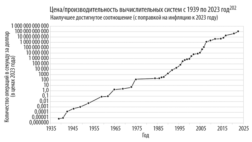 Фундаментальной тенденцией в этой связи является экспоненциальное улучшение соотношения цена/производительность вычислений, то есть увеличение количества операций в секунду, которые можно осуществить с помощью компьютера, затратив один доллар (с учетом инфляции). Первый программируемый компьютер Z2, построенный в 1939 году Конрадом Цузе, был способен выполнить всего лишь 0,0000065 операции в секунду на один доллар стоимости (в ценах 2023-го)201. В 1965 году компьютер PDP-8 уже показывал скорость 1,8 операции в секунду за доллар. В год выхода моей книги «Век разумных машин» (1990) компьютер MT 486DX выполнял 1700 операций в секунду. Когда девять лет спустя была издана книга «Век духовных машин», процессор Pentium III справлялся с 800 000. А в 2005-м (год выхода книги «Сингулярность уже близка») лучшие экземпляры Pentium 4 выполняли 12 миллионов операций в секунду. К тому времени, когда эта книга появится на полках (то есть в начале 2024-го), чипы Google Cloud TPU v5e достигнут быстродействия в 130 миллиардов операций в секунду за доллар! При этом эффективность доступных вычислительных мощностей для потребителей со сравнительно небольшими проектами и доступом в интернет будет еще на несколько порядков выше. Все потому, что облачный вычислительный модуль, способный выполнять квинтиллионы операций в секунду, можно будет арендовать за несколько тысяч долларов в час, вместо того чтобы строить и обслуживать собственный суперкомпьютер. Благодаря тому, что дешевые вычислительные мощности напрямую способствуют инновациям, в глобальном масштабе тенденция к росту производительности техники по отношению к цене сохраняется независимо от конкретной технологической парадигмы, связана ли она со стремлением уменьшить размер транзисторов или увеличить тактовую частоту.