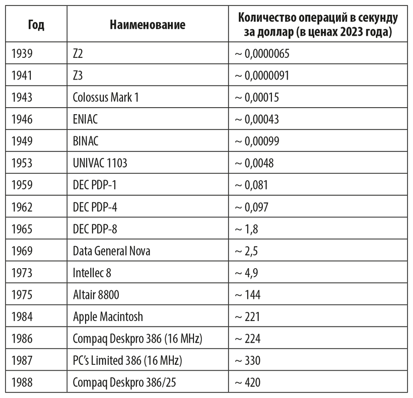 Если говорить о личном опыте, в 1965 году я учился в МТИ, и это был один из самых передовых вузов того времени – у нас уже были компьютеры. Отдельного упоминания заслуживает IBM 7094. Он имел объем памяти в 150 000 байт и мог выполнять четверть миллиона операций в секунду. Стоимость этого компьютера в 1963 году составляла 3,1 миллиона долларов, что эквивалентно 30 миллионам долларов в ценах 2023 года205. На нем работали тысячи студентов и преподавателей. Для сравнения, пока я писал эту книгу, вышел iPhone 14 Pro. Он стоит 999 долларов, а его производительность при работе с нейросетевыми приложениями составляет 17 миллиардов операций в секунду206. Хотя сравнение не совсем корректно, так как многие функции iPhone, заложенные в его цену, не имеют аналогов в IBM 7094, например фотосъемка, да и скорость iPhone заметно ниже в ряде приложений, но вывод ясен. Можно сказать, что iPhone в 68 миллионов раз превосходит IBM 7094 по быстродействию, будучи примерно в 30 000 раз дешевле. Что касается соотношения производительность/цена, у iPhone оно в 2 триллиона раз лучше.