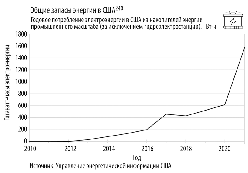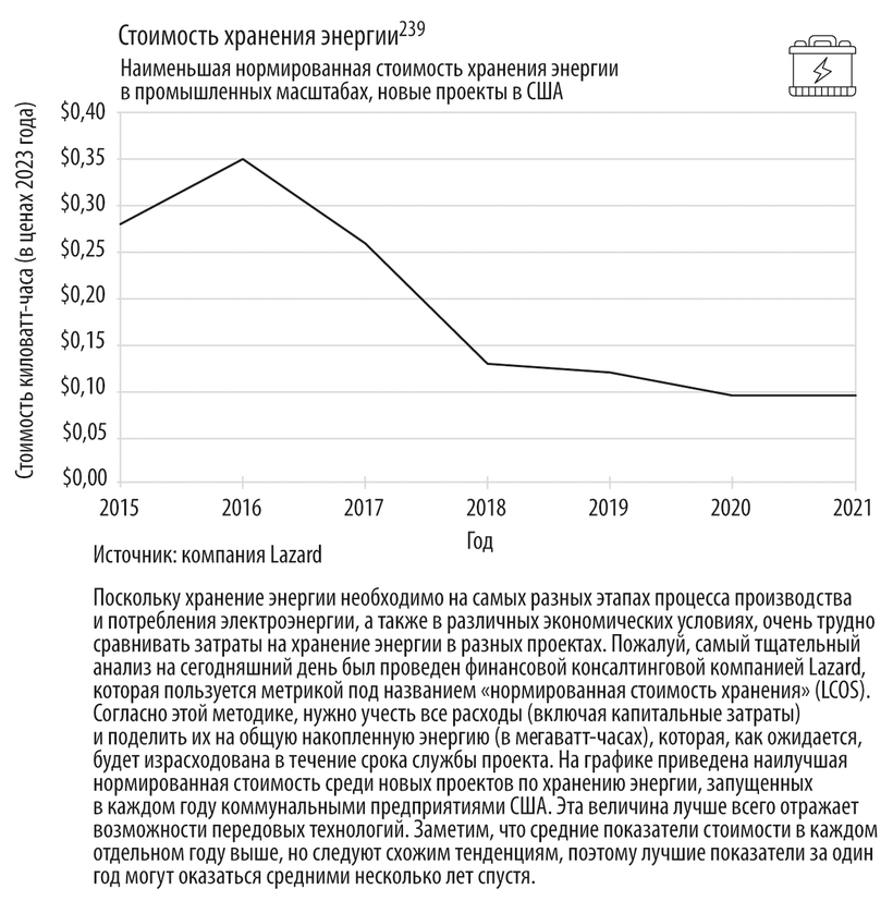 Большинство аккумуляторных батарей не годятся для хранения электроэнергии в промышленных масштабах. Однако литий-ионные аккумуляторы, а также батареи, использующие другие химические процессы, продолжают совершенствоваться. Например, с 2012 по 2020 год стоимость хранения 1 МВт-ч энергии с помощью литий-ионных аккумуляторов снизилась на 80 % и продолжает снижаться237. Когда новые технологии позволят еще сильнее снизить затраты на хранение электроэнергии, альтернативные источники энергии смогут стать основой энергетической системы, заменив ископаемое топливо238.