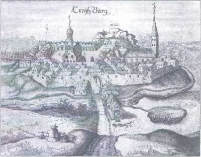 Ещё раньше рядом с восстановленным орденским замком Кройцбург был основан город, который своим правильным четырехугольником особенно ясно выдает планомерность устройства. Стены и вальные рвы, заложенные позднее, как и церковная башня этого городка, показывают чисто оборонительный характер. Как и многие другие города такого типа в Пруссии, Кройцбург остался маленьким земледельческим городом. Грамота об основании датирована 15 января 1315 г.; выдал её Хайнрих фон Плоцке, названный в ней великим комтуром, хотя уже три года являлся верховным маршалом и имел свою резиденцию в Кёнигсберге. Но собственно правовой акт о передаче произошёл ещё во времена Зигфрида фон Фойхтвангена, т. е. до сентября 1310 г. Значительность промежутка времени между актом (правовым) и датой (выдачи) грамоты не была чем-либо необычным, но в этом конкретном случае отсутствует имя Карла фон Трира. Пассивность магистерской канцелярии тем более удивительна, что она контрастирует с последующим доминированием верховного магистра в грамотах, это отчётливо видно в комтурстве Бальга при основании города Бартенштайна. Там целых два магистра берут на себя ответственность за утверждение основания города.