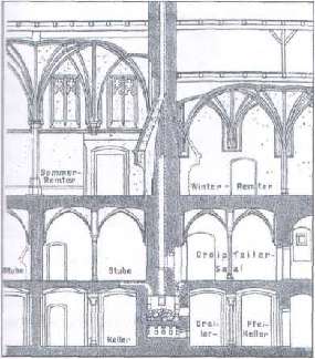 Была тщательно продумана отопительная система, которая путём накаливания камней в подвале по специальным воздушным каналам, через отверстия в полу, подавала тёплый воздух в жилые помещения. Имелись также камины. Благодаря этой отопительной системе суровые прусские зимы переносились достаточно комфортно.