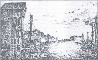 Данциг, гавань. Слева — башня, в далеке — орденский замок (реконструкция, 1930 г.)