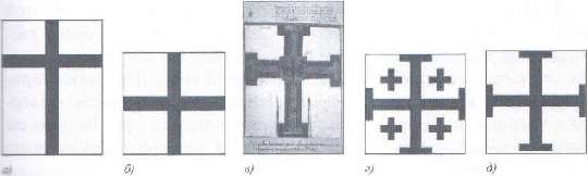 а) латинский крест; б) прямой крест; в) большое знамя великого магистра; г) иерусалимский крест; д) Т-образный крест
