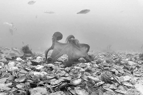 Вспомним еще раз — наш последний общий предок, маленькое червеобразное существо эдиакарского периода, почти наверняка не обладал ни одним из этих навыков. Похоже, что, как только животное начинает вести активный образ жизни, в котором важную роль играют управляемые, целенаправленные, быстрые движения, некоторые способы видения мира и взаимодействия с ним становятся полезнее, чем другие. У различных животных константность восприятия возникла независимо. Хотя в каких-то аспектах осьминоги совершенно точно видят мир не так, как мы, они явно выстраивают отношения с окружающим миром, распознавая объекты, как впервые, так и повторно, и имеют представление о различии между собой и другим. Находясь рядом с осьминогом, невозможно избежать мысли, что они также умеют сосредотачивать немалое внимание на объектах, в особенности новых. В предыдущем разделе я обсуждал исследования болевого поведения у рыб, кур и раков. Как воспринимают боль осьминоги, уяснить нелегко. В Октополисе, нашем австралийском месте наблюдений, мы однажды отсняли большой видеоматериал регулярного агрессивного поведения крупного осьминога-самца, который слонялся по колонии и сцеплялся с другими осьминогами. Он часто «вставал в полный рост» на вытянутых щупальцах, иногда поднимал задний конец туловища выше головы. Мы полагаем, он делал это, чтобы казаться как можно больше; эти демонстрации часто предшествовали нападениям на других осьминогов. Однажды, когда он принял такую позу, мелкая, но злобная рыбка (шипастая кожанка) подлетела и укусила его прямо в зад. Вот кадр укуса (рыбка вверху в центре):
