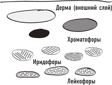 Представьте себе кожу каракатицы сбоку в разрезе. Мы увидим верхний слой, затем слой, заполненный миллионами крошечных красочных мешочков, каждый из которых постоянно растягивается и сжимается, то показывая, то скрывая пигментное содержимое. Это происходит на огромной скорости, с помощью многочисленных мышц. Часть света проходит сквозь этот слой и попадает на следующий, где его отразят и отфильтруют стопки зеркал. Эти клетки тоже меняют форму, намного медленнее, когда получают откуда-нибудь химический сигнал. Еще дальше вглубь простые зеркальные клетки отражают любой свет, который до них дойдет.