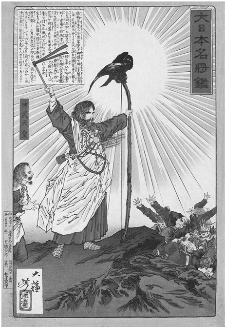 Цукиока Ёситоси. Император Дзимму. Гравюра на дереве. 1880 г.