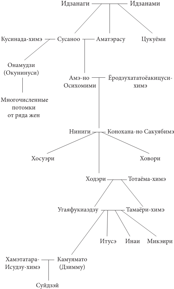 О Дзимму можно рассказать много интересного. Он был младшим сыном, но именно он стал очередным выразителем воли Аматэрасу. При рождении его назвали Камуямато Иварэбико-но микото – Юноша-бог Иварэ из божественного Ямато (Иварэ – название населенного пункта и построенного там дворца), и родители его – боги. Однако в соответствии с традицией он считается полубогом. Нелогично, но символично: его роль в легендах – стать связующим звеном между миром богов и миром людей. И его императорское или, что в данном случае вероятнее, посмертное имя (не забываем об инициациях, связанных с изменением статуса, в том числе с уходом из мира людей в мир богов) – Дзимму, что означает «Оружие богов» или «Воин богов». Обратите внимание – уже не бог, а тот, кто призван выполнять на земле их волю.