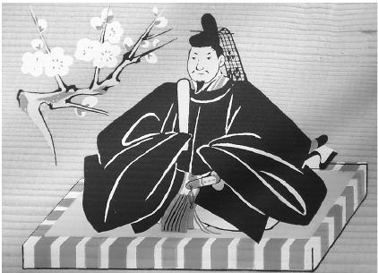 Изображение Сугавара-но Митидзанэ. В левом верхнем углу – его любимое растение, японская слива