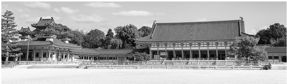 Башни Дайгоку-ден и Бьякко-ро (башня Белого тигра) храма Хэйан Дзингу в Киото
