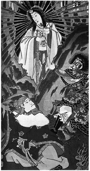 Утагава Кунисада. Аматэрасу со своими священными атрибутами. Гравюра. Фрагмент. Сер. XIX в.