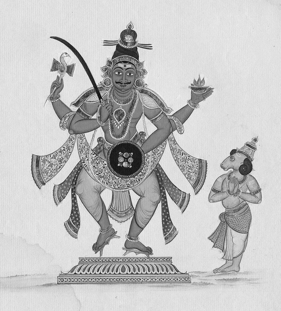 И еще один миф, на этот раз связанный не с семейными взаимоотношениями, а исключительно с ритуальным жертвоприношением, на которое (знакомое развитие событий!) приглашены все боги, кроме гневливого Рудры. Он не просто портит ритуал, пронзив подготовленную жертву – антилопу – стрелой, но и устраивает настоящее побоище: ломает руки Савитару, выбивает концом своего лука зубы Пушану и глаза Бхаги и в конце концов добирается до Дакши, которому отрубает голову. Отыскать эту часть тела бога не удается, и приходится довольствоваться тем, что удалось найти, – козлиной головой. Вот почему божество обычно изображается именно таким – с человеческим телом и головой животного.