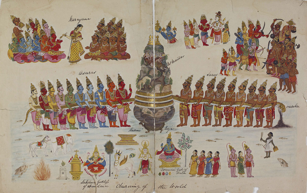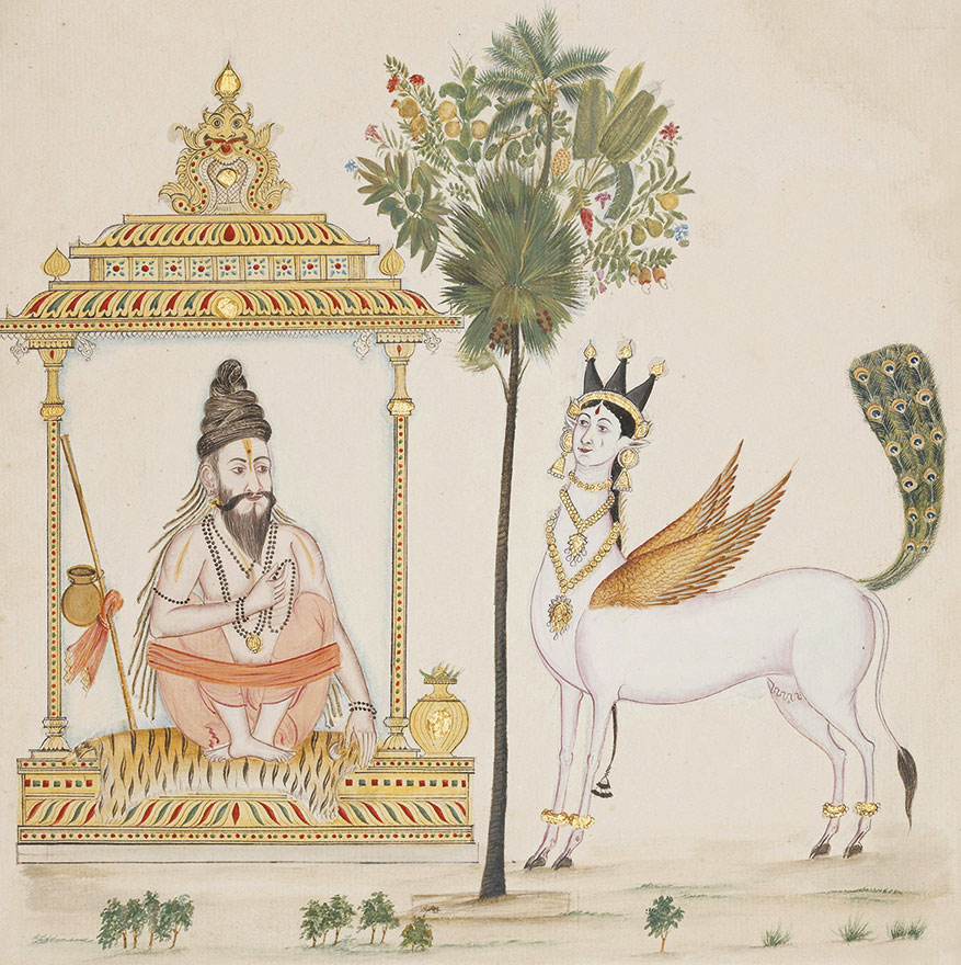 Чудесная корова с головой женщины Сурабхи и ее хозяин мудрец Васиштха. Миниатюра. 1-я пол. XIX в.