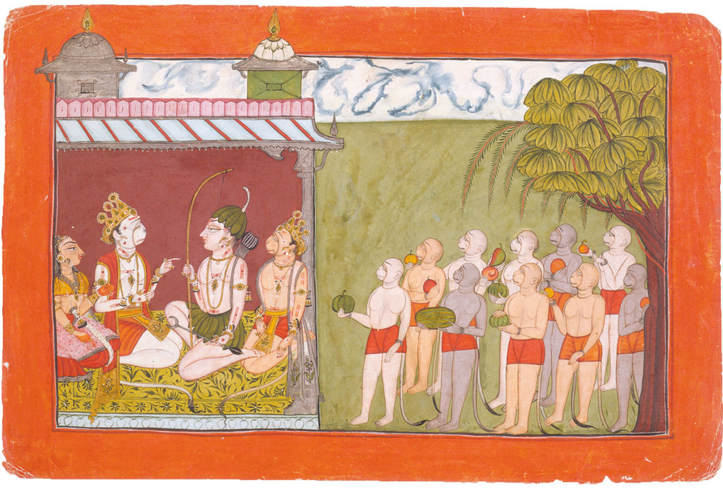 Эпизод из «Рамаяны» с участием Ханумана. Индийский манускрипт. Нач. XVIII в.