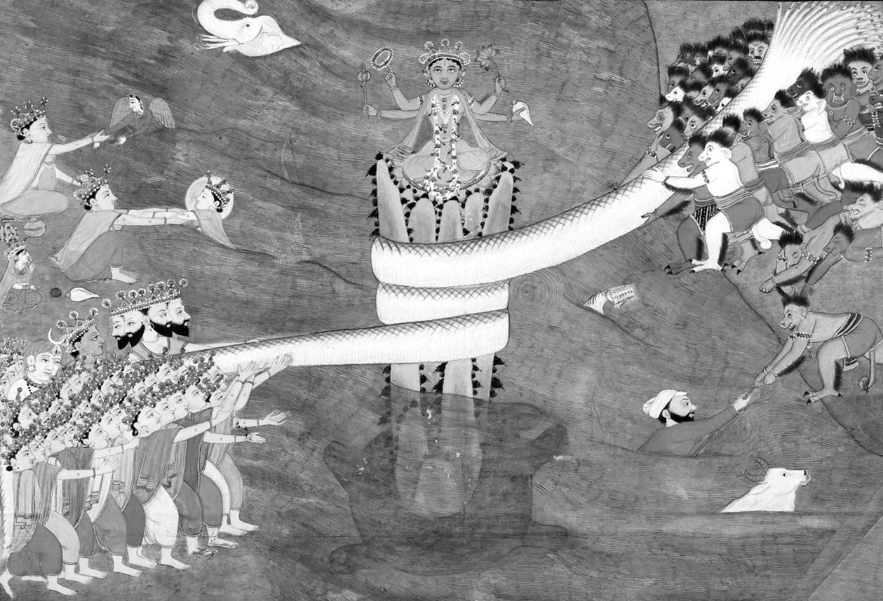Сома не единственный божественный напиток, являющийся частью мифа о творении. Своеобразный и интересный миф, приведенный в «Махабхарате», рассказывает о том, как боги и асуры, понимаемые в данном случае как демоны, договорились пахтать океан. В итоге появился напиток бессмертия – амрита. Совместными усилиями боги и асуры вырвали из земли гору Мандара и поставили ее на черепаху – опору земной тверди. Помощник богов – змей Шеша, точнее, его ипостась Васуки, послужил «веревкой» – им обвили Мандару. И этой веревкой с привязанной к ней горой много лет пахтали (взбивали) океан. Сначала вода превратилась в молоко, затем – в масло… Основная цель – получение божественного напитка – была достигнута. Однако в процессе появилось много «побочных продуктов», тоже чудесных. Родились бог луны Сома, богиня царской власти Шри (в некоторых мифах, вероятно, более поздних по времени появления, это было одно из имен Лакшми), богиня вина Сура (персонификация одноименного напитка). Появился Уччайхшравас – белый конь Индры – и атрибут Вишну волшебный камень Каустубха. И вот из океана возник бог врачевания Дханвантари, держащий в руках сосуд с амритой.
