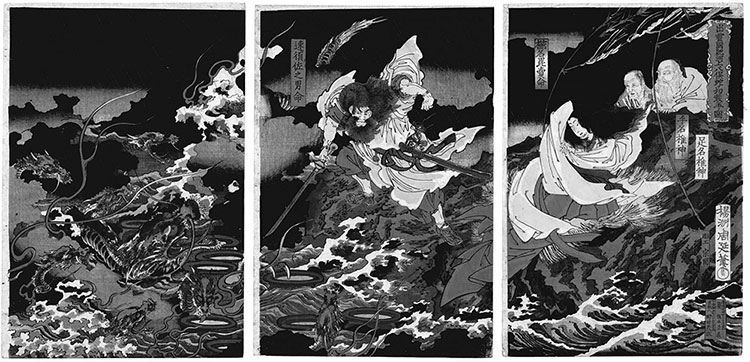 Тоёхара Тиканобу. Ками Сусаноо-но Микото убивает восьмиглавого зверя Ямата-но ороти. 1870 г.
