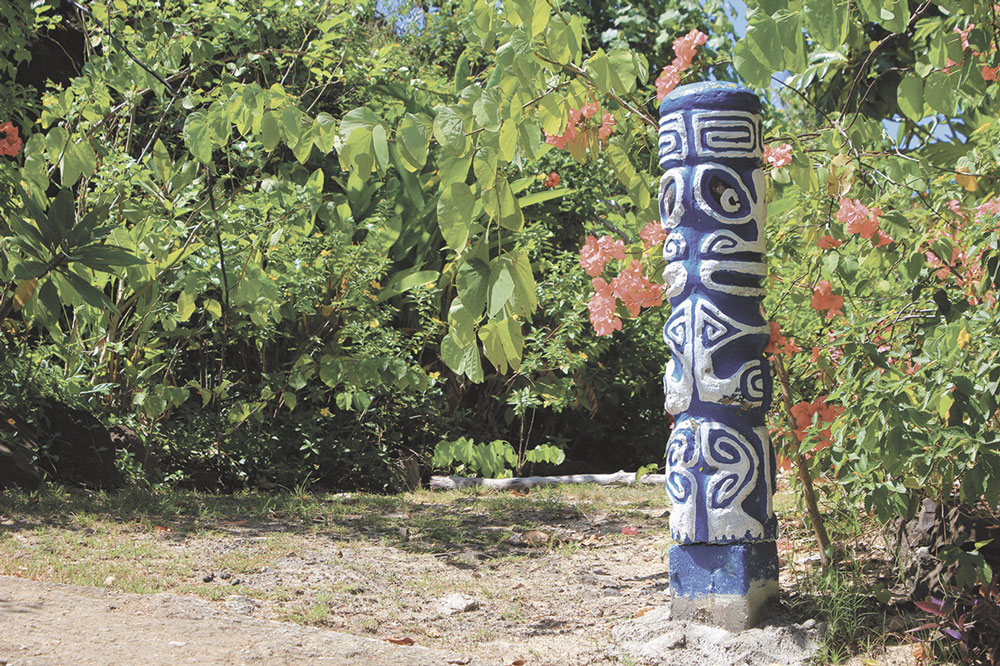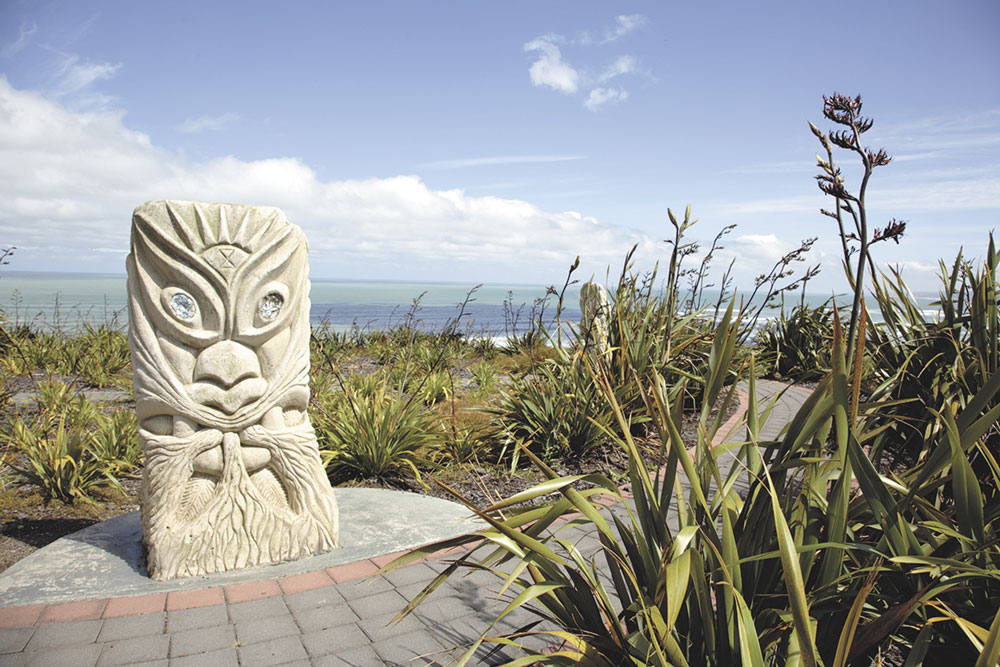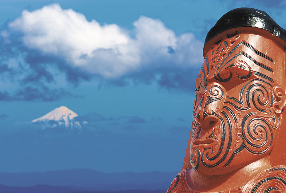 Традиционная резьба маори на фоне горы Таранаки. Новая Зеландия