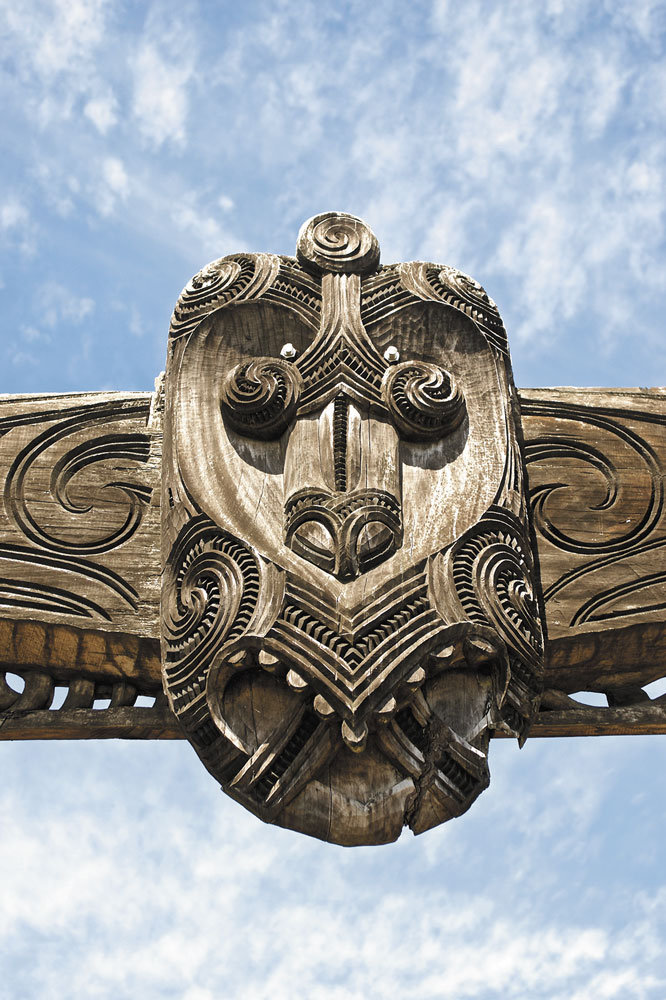 Традиционный деревянный шест Поу-Венуа, резьба по дереву Вакаиро из культуры маори. Северный остров Таранаки, Новая Зеландия