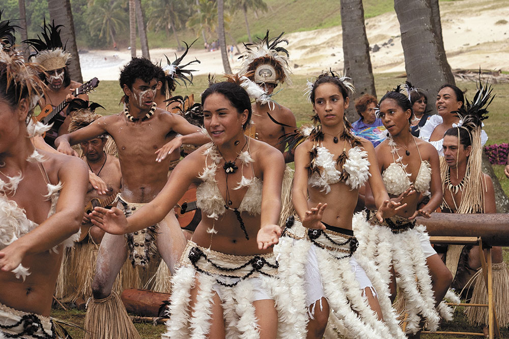Полинезийское фольклорное шоу с танцами и традиционными костюмами на пляже Анакена. Остров Пасхи, Чили