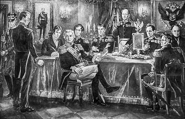 Вопрос: Князь Трубецкой и другие равно считали вас разделявшим их образ мыслей и намерений, а следственно (по их правилам приема в члены), принадлежащим к их Обществу и действующим в их духе… Рылеев и Александр Бестужев прямо открыли вам, что есть Общество людей, стремящихся к преобразованию России и введению нового порядка вещей; говорили вам о многочисленности сих людей, о именах некоторых из них, о целях, видах и средствах Общества…