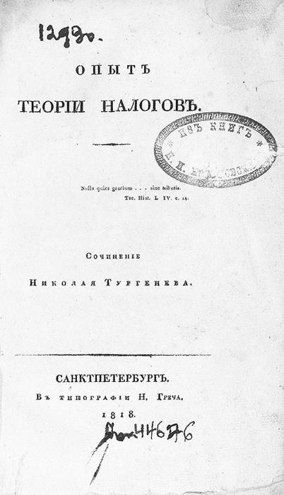 Титульный лист первого издания книги «Опыт теории налогов» Н.И. Тургенева, 1818