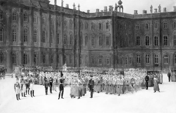 В. Н. Максутов. Николай I перед строем лейб-гвардии Саперного батальона во дворе Зимнего дворца 14 декабря 1825 года. Ок. 1861