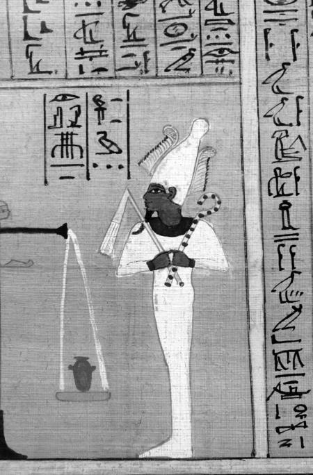 Изображение Осириса, стоящего перед весами с сердцем усопшего. Ок. XIV в. до н. э.