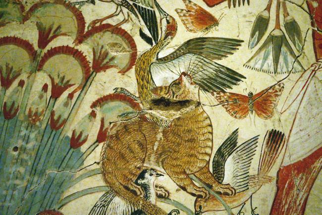 Изображение кота, схватившего птицу, из Гробницы Небамона. XV–XIV вв. до н. э.