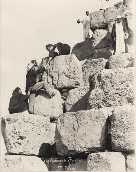 Европейские путешественники взбираются на пирамиду Хеопса. Фото ок. 1860–1880-х гг.