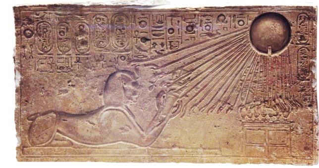 Эхнатон в образе сфинкса беседует с солнцем-Атоном. Хорошо видны «ладошки» на концах солнечных лучей. XIV в. до н. э.