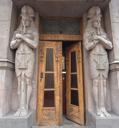 Скульптуры в египтизирующем стиле у дверей доходного дома А. И. Нежинской в Санкт-Петербурге. 1910-е гг.