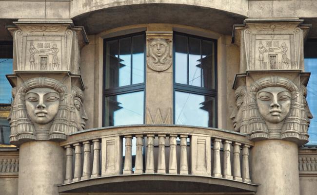 Элементы декора в египтизирующем стиле у балкона доходного дома А. И. Нежинской в Санкт-Петербурге. 1910-е гг.