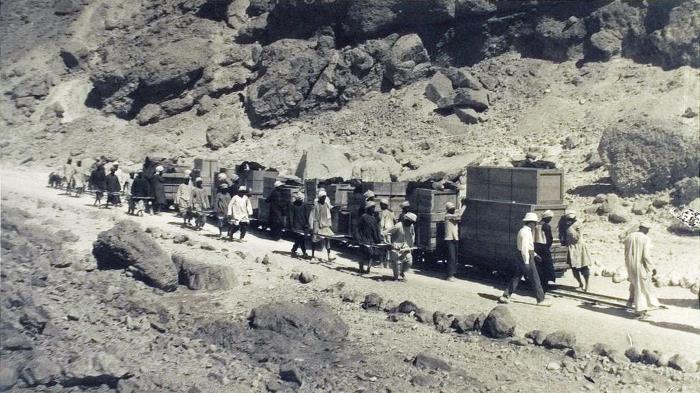 Вывоз сокровищ из гробницы Тутанхамона по специально построенной временной колее. Фото 1922 г.