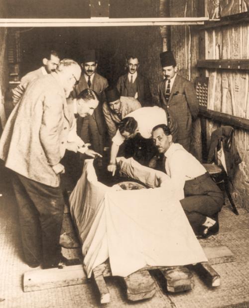 Г. Картер с помощниками извлекает из саркофага мумию Тутанхамона. Фото 1925 г.