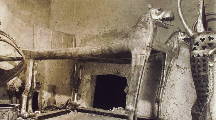 «Царское ложе» в гробнице Тутанхамона. Хорошо видна дыра в перегородке, некогда проделанная грабителями. Фото 1922 г.