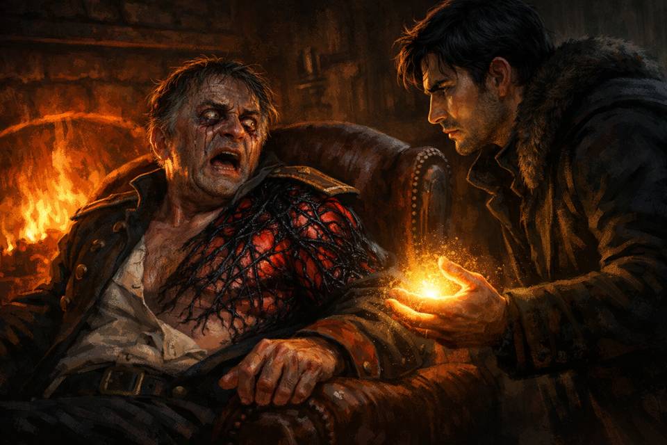 Я едва слышно выругался себе под нос и внимательнее пригляделся к его ауре. Вокруг раны ветвилась какая-то странная паутинка из эдры — тёмная, почти чёрная, медленно разрастающаяся во все стороны, особенно вниз по руке. Я попытался очистить её с помощью целительной энергии, но не вышло.