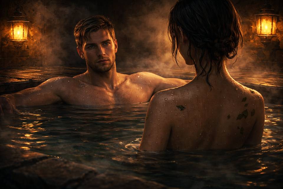 Рада вышла за мной чуть позже — обнажённая, разгорячённая, с прилипшими к телу мелкими листками от банного веника. Волосы её прилипли к лицу мокрыми прядками. Остановилась перед купелью, замерев будто в нерешительности. Её кожа блестела в полутьме, будто покрытая маслом, и кажется, даже немного светилась изнутри. Я невольно замер, любуясь ею — её тонкой точёной фигуркой, плавными изгибами, лукаво-смущённой улыбкой, взглядом влажных колдовских глаз…