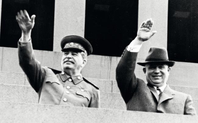 Иосиф Сталин (слева) и Никита Хрущев приветствуют участников первомайской демонстрации на трибуне Мавзолея В. И. Ленина
