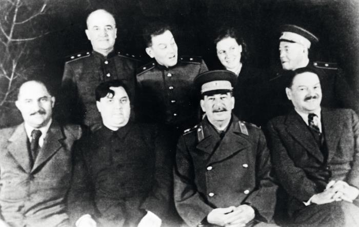 Первый ряд слева направо: Вячеслав Молотов, Лазарь Каганович, Николай Булганин, Климент Ворошилов, Лаврентий Берия, Георгий Маленков. Второй ряд слева направо: Никита Хрущев, Анастас Микоян и другие