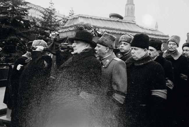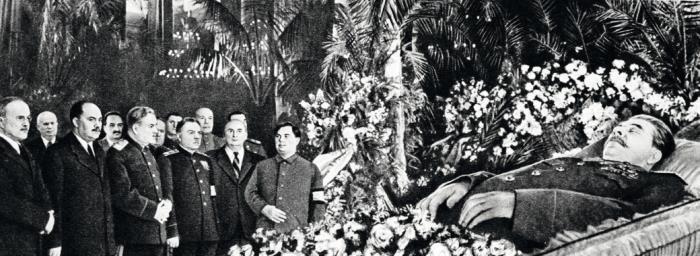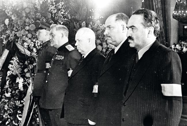 Фотография с выставки, посвященной 50-летию со дня смерти Иосифа Сталина. Гроб с телом Сталина несут (слева направо): Лаврентий Берия, Климент Ворошилов, Никита Хрущев, Анастас Микоян и Михаил Суслов