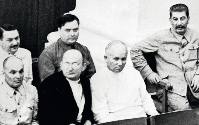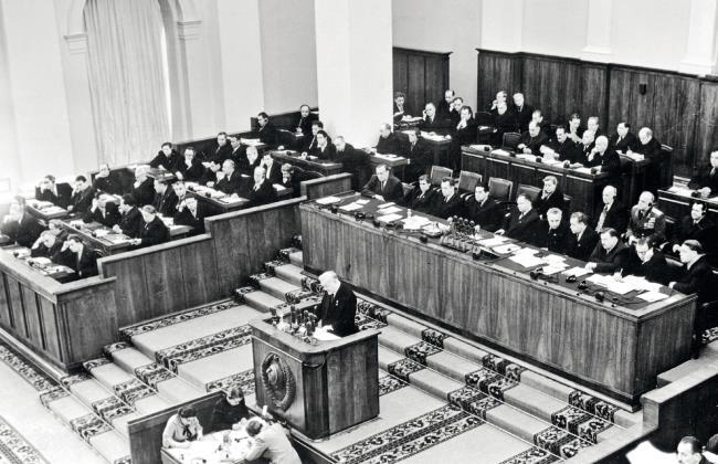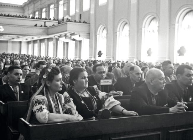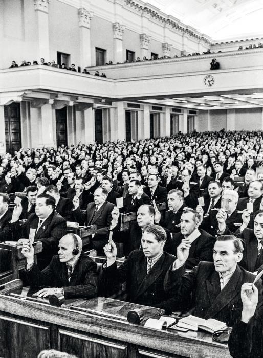 Иосиф Сталин, Никита Хрущев, Лаврентий Берия, Матвей Шкирятов (в первом ряду справа налево), Георгий Маленков и Андрей Жданов (во втором ряду справа налево) на совместном заседании Совета Союза и Совета Национальностей I сессии Верховного Совета СССР I созыва