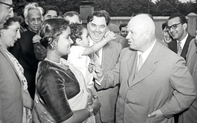 Визит индийской делегации в СССР. Первый секретарь ЦК КПСС, Председатель Совета Министров СССР Никита Сергеевич Хрущев и министр электростанций СССР, член Президиума ЦК КПСС. Георгий Максимилианович Маленков (в центре) во время беседы с членами делегации. На заднем плане – вице-президент Индии Сарвепалли Радхакришнан (слева в черной одежде)