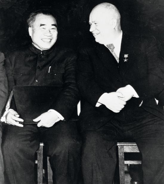 Н. С. Хрущев (справа) беседует с членом делегации Коммунистической партии Китая Чжоу Эньлаем во время перерыва между заседаниями ХХ съезда КПСС