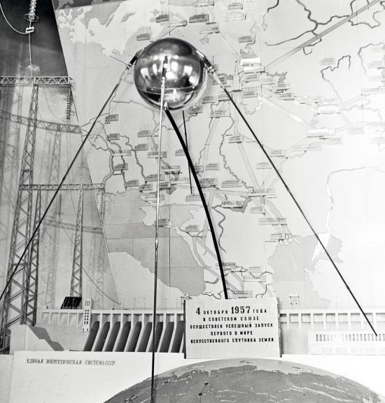 Модель первого советского космического искусственного спутника Земли в павильоне «Наука» на Всесоюзной сельскохозяйственной выставке в Москве. Советский космический аппарат был запущен на орбиту 4 октября 1957 г.