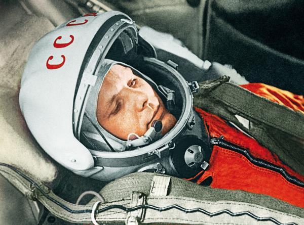 Космонавт Юрий Гагарин в кабине космического корабля «Восток-1» перед стартом. Космодром Байконур, 12 апреля 1961 г.