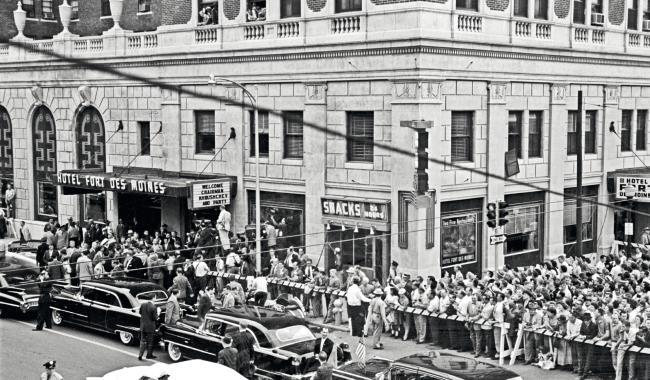Жители города Де-Мойн (штат Айова) приветствуют советского гостя у гостиницы «Форт Де-Мойн»